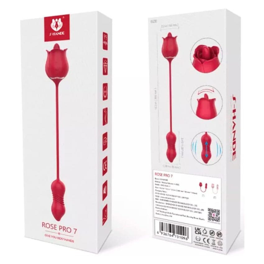 Rose Pro 7 es un vibrador diseñado con dos extremos para satisfacer todas tus necesidades, un extremo cuenta con una potente bala vibradora con movimiento, y el otro con una rosa, que contiene una lengua para simular una estimulación oral perfecta.